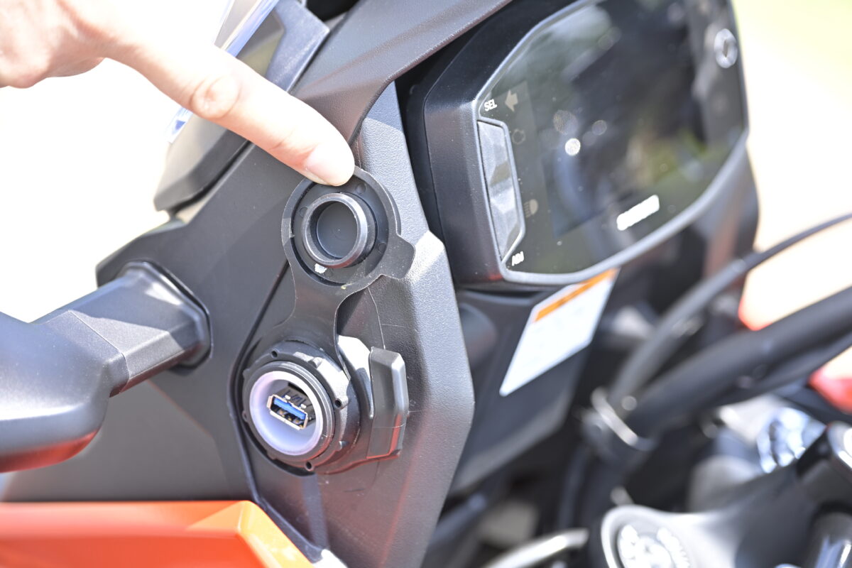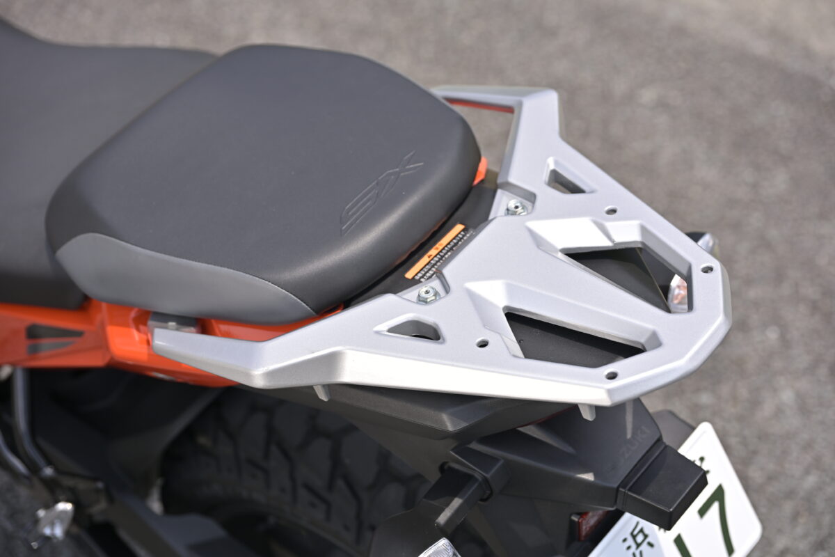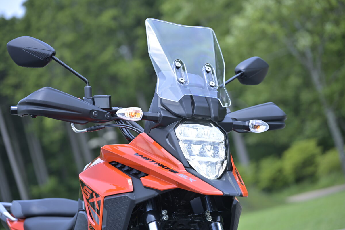 また、走行テストを重ねて開発されたウインドスクリーンは、コンパクトながら防風性を発揮し、身体に当たる走行風を低減している。ただし、走行風は多少ウインドスクリーンを巻き込むように流れ込んできて、胸に当たるのを感じる。と言っても、ネイキッドやオフロードモデルのように走行風が胸にダイレクトに当たるわけではなく、前後サスもフラットな乗り心地を提供してくれるので、高速道路での100km/h巡航は心地よい風を感じながら淡々と走り続けていける快適さがある。リラックスしたライディングポジションを取りつつ、シートのクッション性もいいのでお尻が痛くなりにくく、単気筒エンジンでもロングツーリングに向いた乗り味となっているのがVストローム250SXの特長だ。
