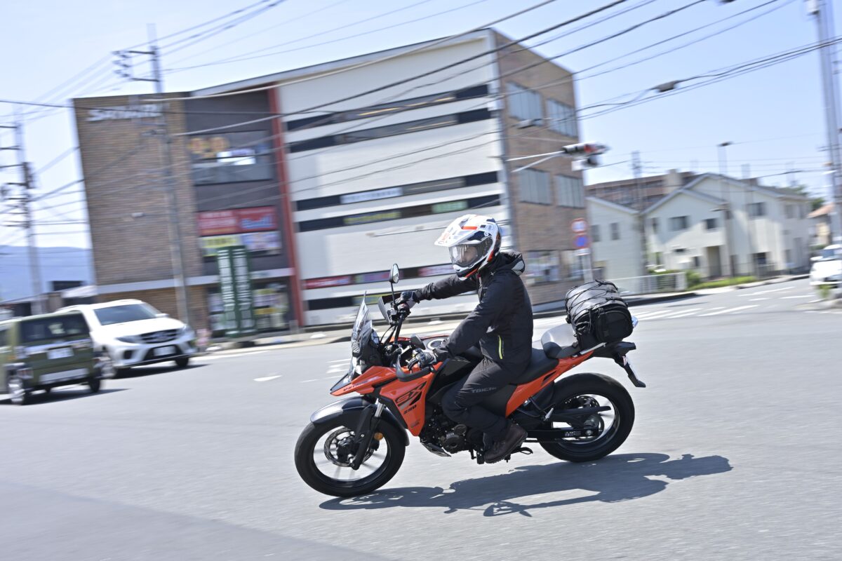 Vストローム250SXの油冷エンジンはジクサー250をベースとしているが、エアクリーナーを見直すことで低中速トルクが向上している。実際に市街地を走行してみると、トルクは太いというより粘るように感じた。スロットルを大きく開けても押し出されるような加速力は感じないものの、スロットルを閉じてエンジン回転が下がった時でもパスンと急にエンストするような兆候は皆無だった。ゴー&ストップの多い市街地走行では低回転域を多用するが、そうした際にVストローム250SXは不意にエンストしにくく、バランスを崩す不安も少ない。