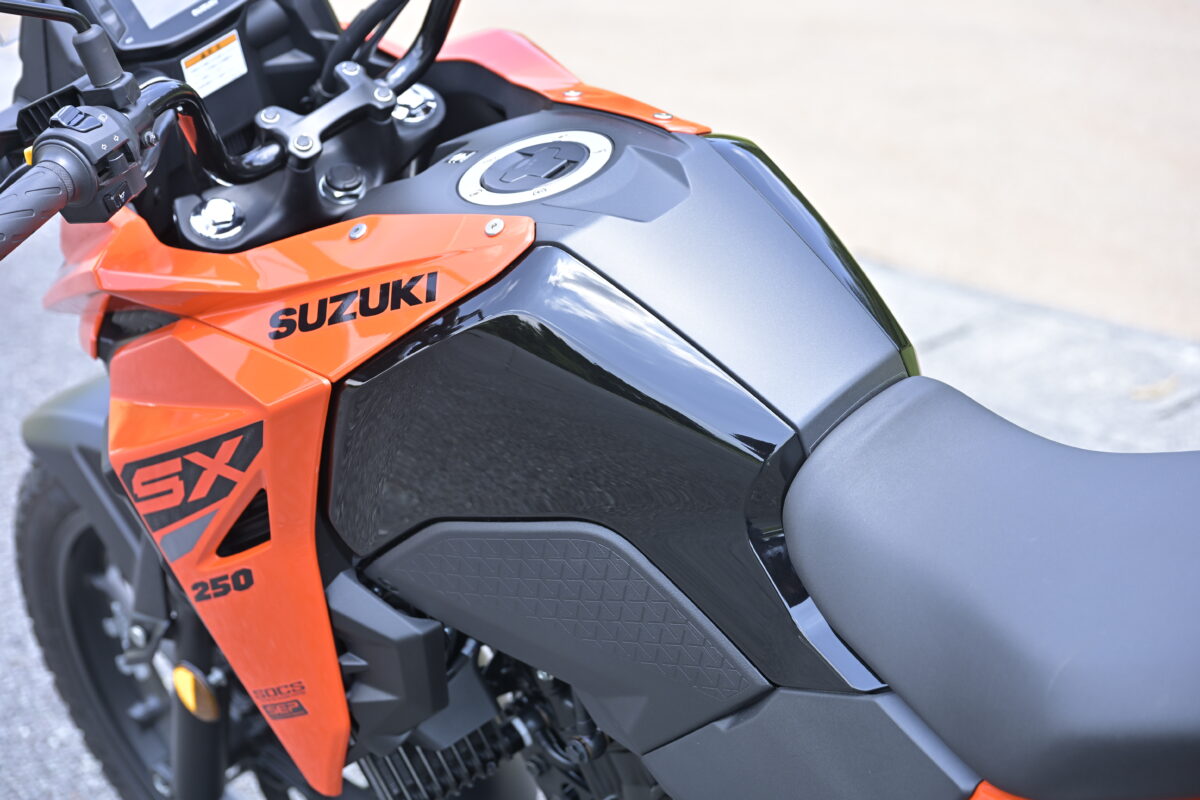 Vストローム250SXは、オンロードスポーツモデル「ジクサー250」をベースに開発されているが、ツーリング先のワインディングやラフロードなどを楽しめるアドベンチャーモデルとして最適化され、Vストローム250SX独自の機構を装備している。