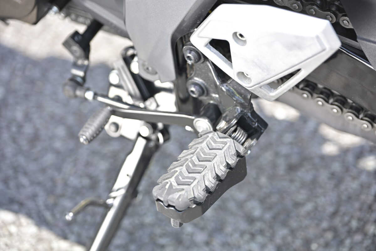 大径ホイールは直進安定性に貢献しているが、押し引きの際や左折など徐行時のハンドル操作には粘りがあり、立ち(直立性)の強さも感じた。大径ホイールを装着しているオフロードバイクでの走行経験のあるライダーなら、この立ちの強さも予想できるだろうが、17インチホイールのシャープなハンドリングに慣れたライダーには、少しダルく感じるかもしれない。ただし、ハンドリングの粘りは極低速時だけで、小走り程度のスピードが出ていれば軽快でスムーズな操作性となる。