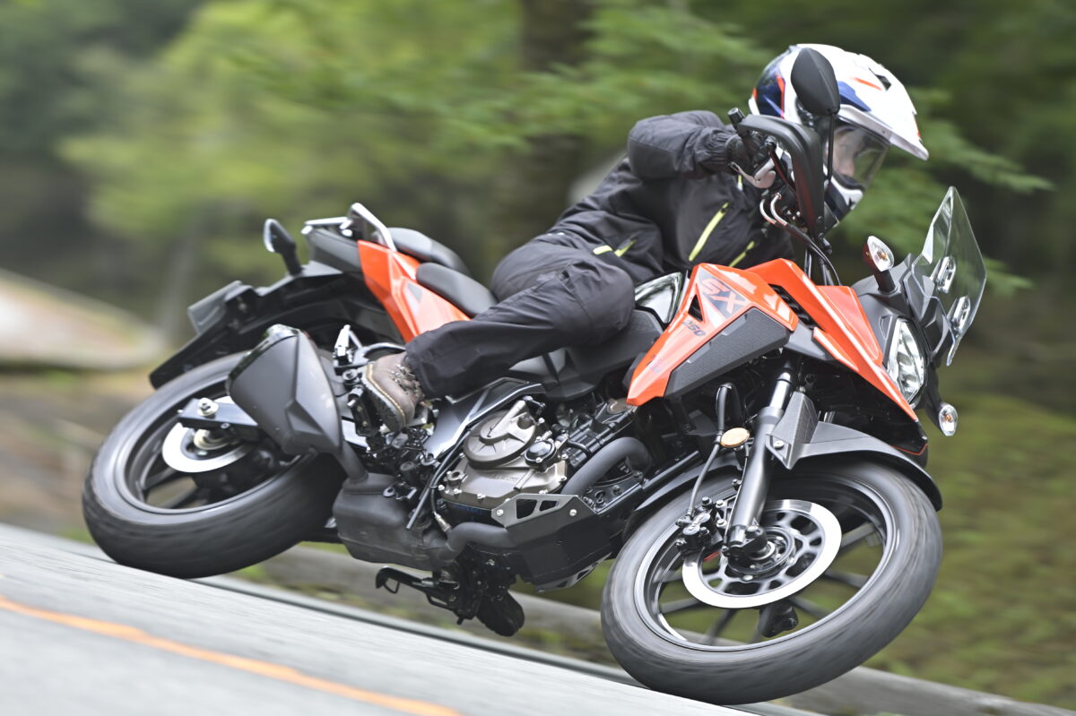 車両の押し引きではハンドル操作に粘りを感じたが、微速でも前進していれば、ハンドル操作はスムーズに行なえる。コーナーへの進入時には少し立ちの強さを感じるが、車体の倒し込みとハンドル操作に粘りはなく、Vストローム250SXも狙ったラインでのスムーズなコーナリングが決まる。連続コーナーでの車体の切り返しでも車重を感じず、大径化した前輪のデメリットはほとんど感じなかった。