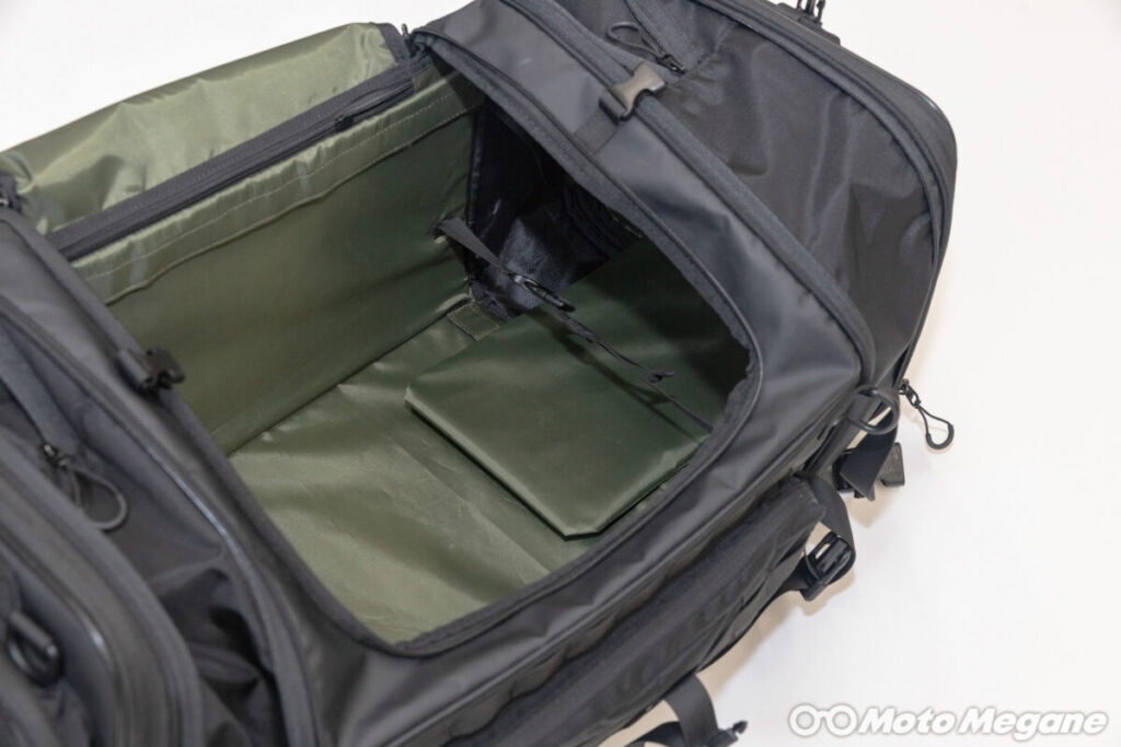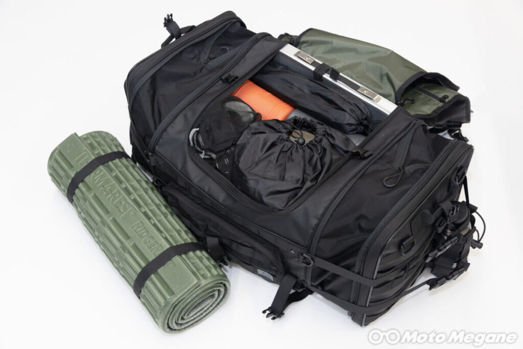 「TC07 TACTICAL SEAT BAG L」は、2泊以上のツーリングや泊まりでのキャンプに最適な50ℓの大容量を確保。しかも容量可変が可能で、予想外のお土産や買い物にも容量を65ℓにアップして対応できるようになっている。