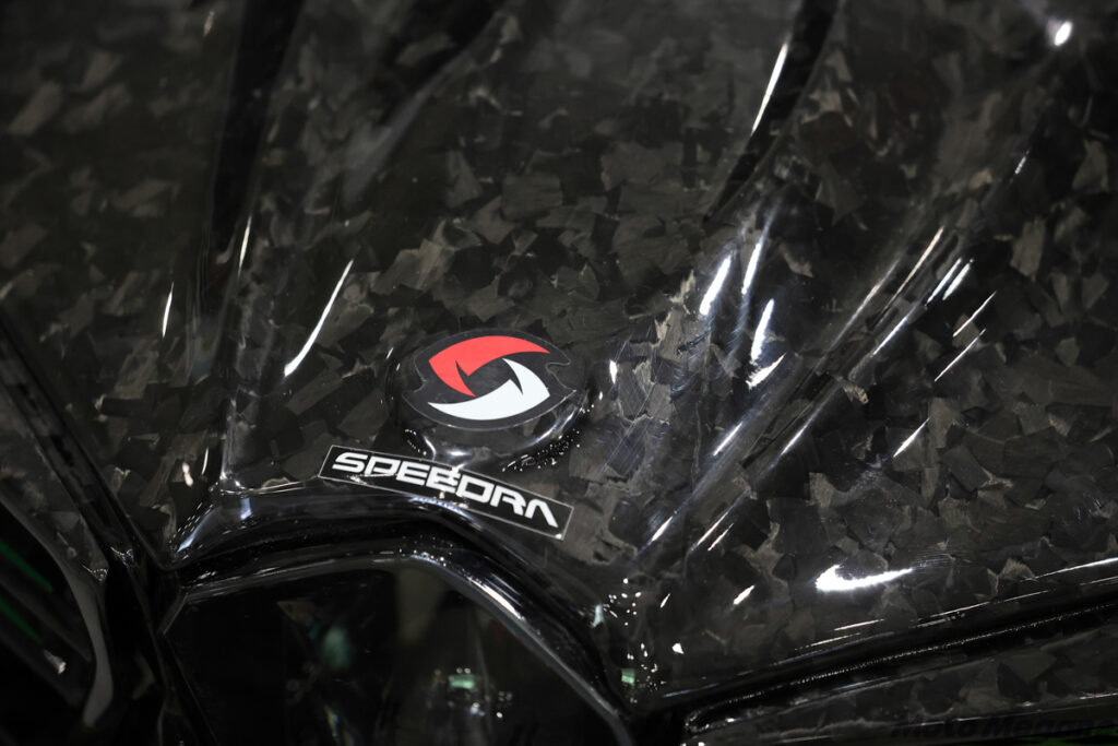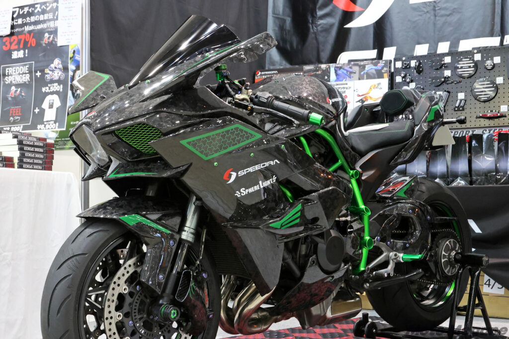 東京モーターサイクルショー2023のSPEEDRAブースでとにかく目を引いたのが、フォージドカーボン素材の外装パーツをフルに装着したカワサキ・Ninja H2のカスタムマシンだ。