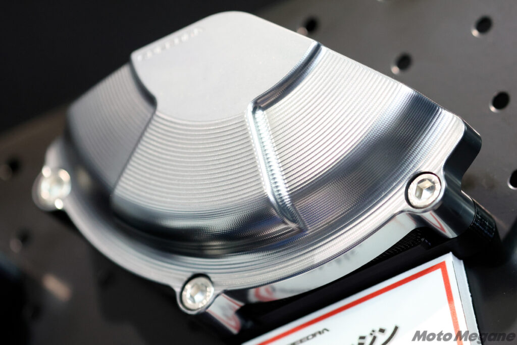 高強度を誇るアルミ合金A6061-T6材を削り出し、アルマイト処理により美しく仕上げたエンジンカバー。万が一の転倒時に、衝撃や路面との摩擦でエンジンケースが破損するトラブルを低減できる。アルマイトカラーは、車種ごとに設定が異なり、基本的には3~4色から選択できる。
