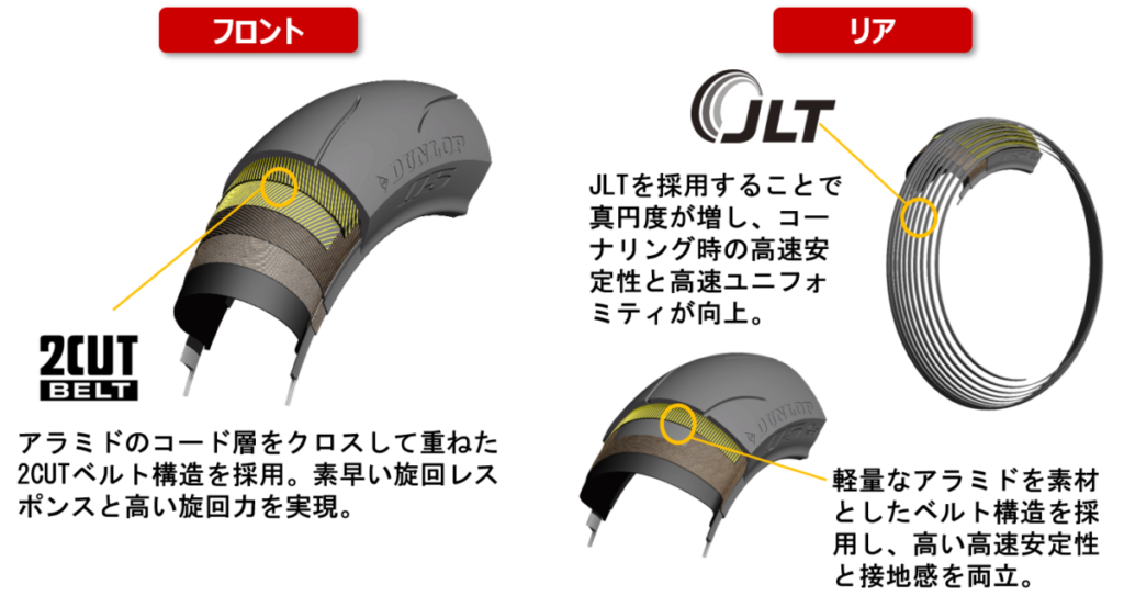 フロント構造はトレッド剛性を柔軟にする方向に最適化し、従来品より接地感を向上。また、アラミドのコード層をクロスして重ねた2CUTベルト構造を採用し、素早い旋回レスポンスと高い旋回力を実現しています。リアはトレッドゴムを連続して巻き付けるJLT(ジョイントレス・トレッド構造)を採用し、真円度