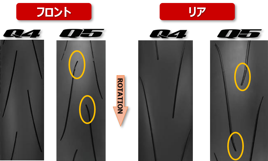従来品と比べてセンター近くまで溝を伸ばし、トレッドセンターからバンクの中間域までの常用域で排水効率を向上させています。