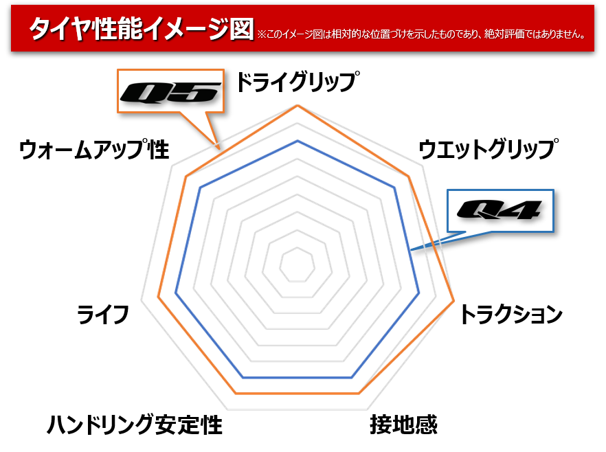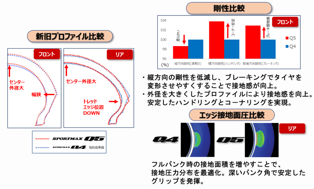 「SPORTMAX Q5」は、公道走行で必要とされるウォームアップ性やウエット性能を確保しつつ、レース用微粒子カーボンを採用したコンパウンドや新プロファイルの採用により、米国で高い評価を受けた従来品「SPORTMAX Q4」からさらにサーキット性能(ドライグリップ)を強化したハイグリップタイヤです。「サーキットに生息するストリートタイヤ。」をキャッチコピーに、スリックライクな見た目で、トレッドエッジ部分には商品ロゴを刻印し、性能向上だけではなくデザインの細部にまでこだわっています。