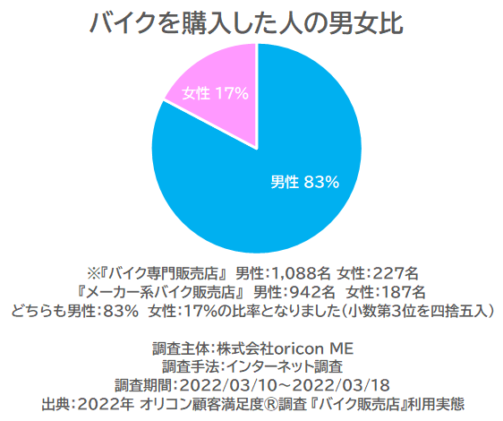 バイクを購入した人の男女別では、『バイク専門販売店』『メーカー系バイク販売店』いずれも男性が83%、女性が17%となり、男性が大多数を占める結果となりました。