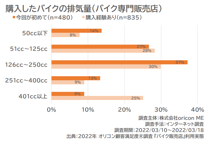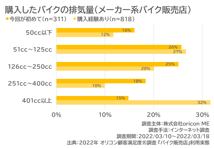 また、購入したバイクの排気量を購入経験別にみると、今回が初めてと答えた人は「51cc~125cc」「126cc~250cc」が多い結果でした。一方、購入経験ありと答えた人は「401cc以上」も多く、特にメーカー系バイク販売店では32%と最多となっており、いわゆる大型バイクを志向する層が目立つ結果となりました。