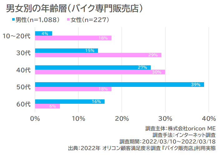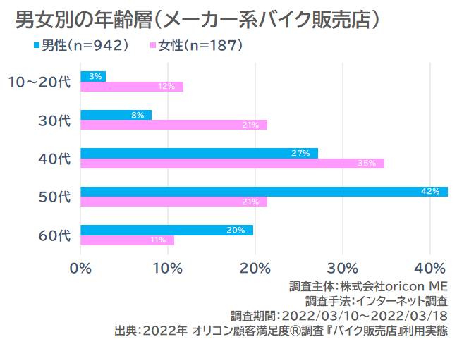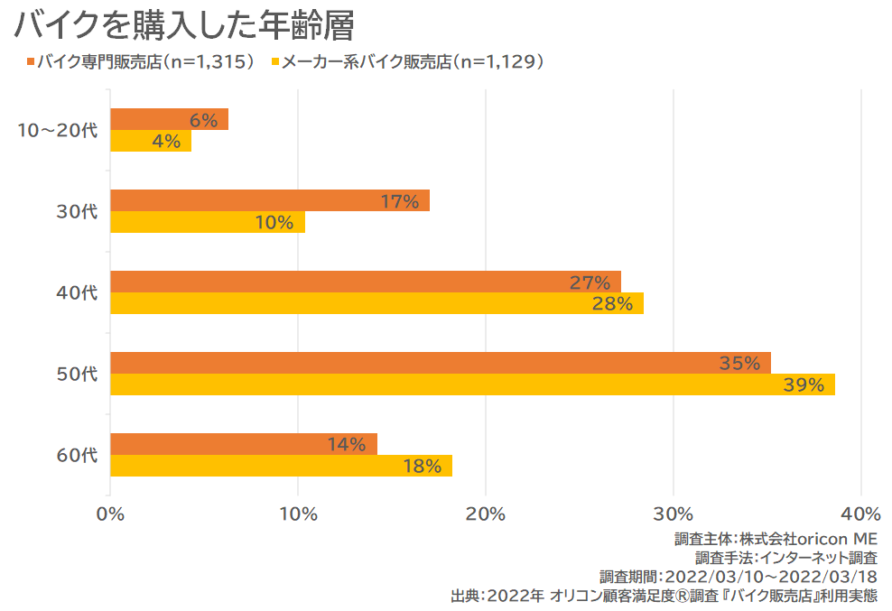 また、10~20代と30代は『バイク専門販売店』が比較的多く、40代以上は『メーカー系バイク販売店』が比較的多いことがうかがえます。