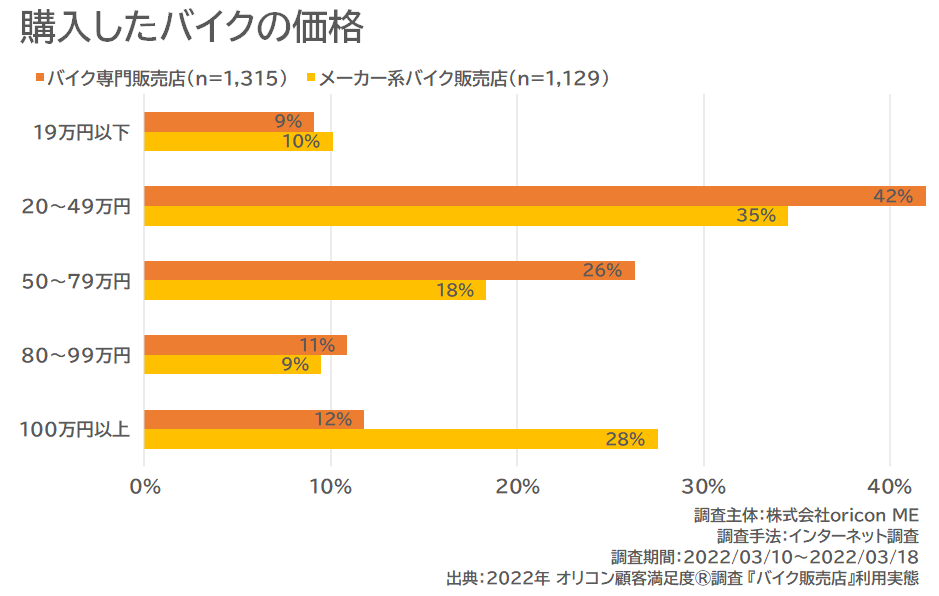 ・バイクの購入価格は「20~49万円」が最多 メーカー系バイク販売店は「100万円以上」が2番目に多い結果に