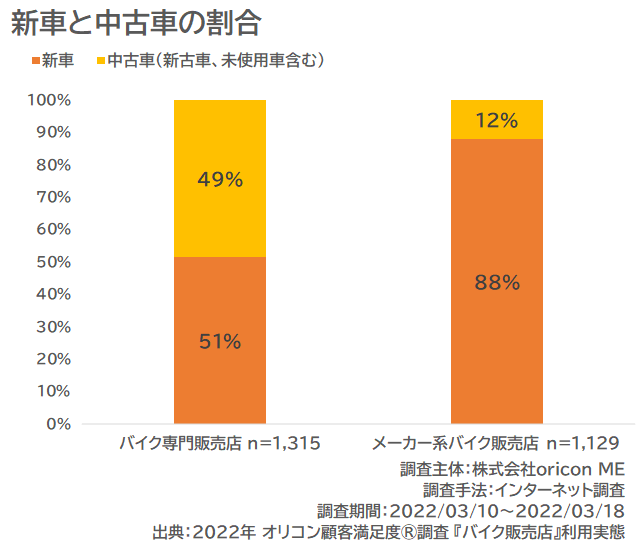 この違いの理由として考えられるのは、新車購入の割合です。購入したバイクが新車か中古車かを問う設問では、『バイク専門販売店販売店』ではほぼ半数ずつの回答に分かれたのに対し、『メーカー系バイク販売店』では「新車」と回答した割合が88%と多数を占める結果となりました。