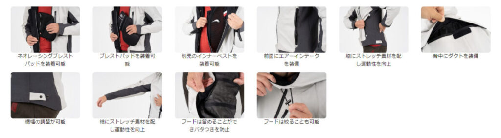 ソフトなゴートスキン にドライタッチの防風ストレッチ素材を組み合わせたフードスタイルのレザージャケットです。レザーの中でも軽量で柔軟性のあるゴートスキンを採用することで、身体へフィットしやすくなっており、長距離走行でも疲れにくいという特徴があります。また、内袖を防風ストレッチ素材に切り替えることで、運動性が向上しさらに着心地良く仕上がっています。脇の大型ファスナーの上部を開けるとエアーインテークとなり、背中にあるダクトを開くことで、ジャケット内のこもった空気を換気することができます。エアーインテークを使わない時はポケットとして使用出来ます。フードはバタつき防止機能を使用することで、走行中のストレスを軽減します。着心地や耐久性の高さから長時間の走行はもちろん、フードがあることで、カジュアルな印象になりますので街乗りがお好きな方にもおすすめの一着です。