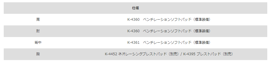 ●仕様:〈肩、肘、背中〉ソフトパッド標準装備(脱着式)