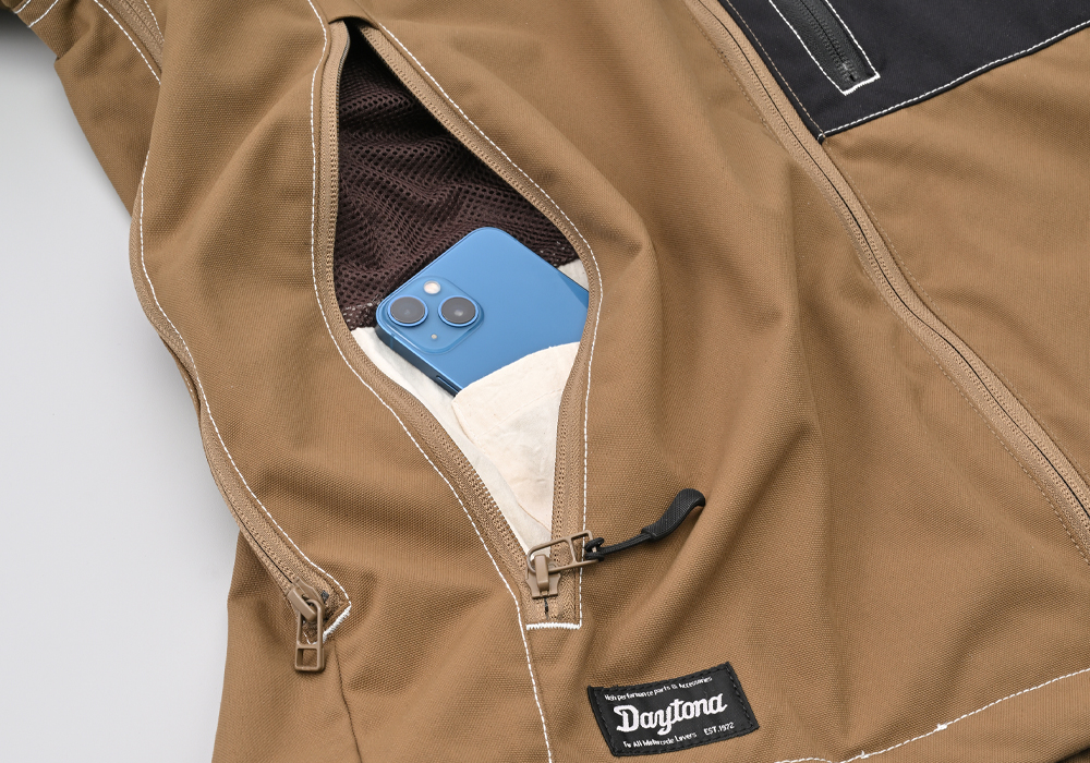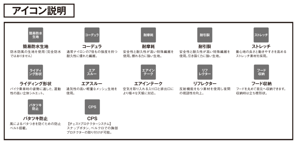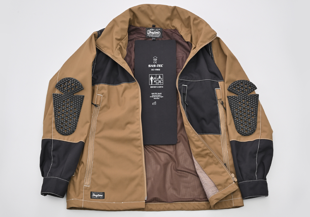 簡易防水+防風+大型エアベンチポケットのアウトドアパーカー風デザインのエアインテークパーカージャケット。フードは襟の裏側に丸めて固定可能。全てのポケットは裏地がメッシュ素材で、開口すると通気性が良くなります。フロント大型ポケットには携帯などの小物が入れられるように小型ポケットを内蔵。ひじ、背中のプロテクターには、【CE規格】をクリアしたTRIPLEFLEXタイプのSAS-TECを標準装備。胸部はCPS規格のプロテクターが装着できます。