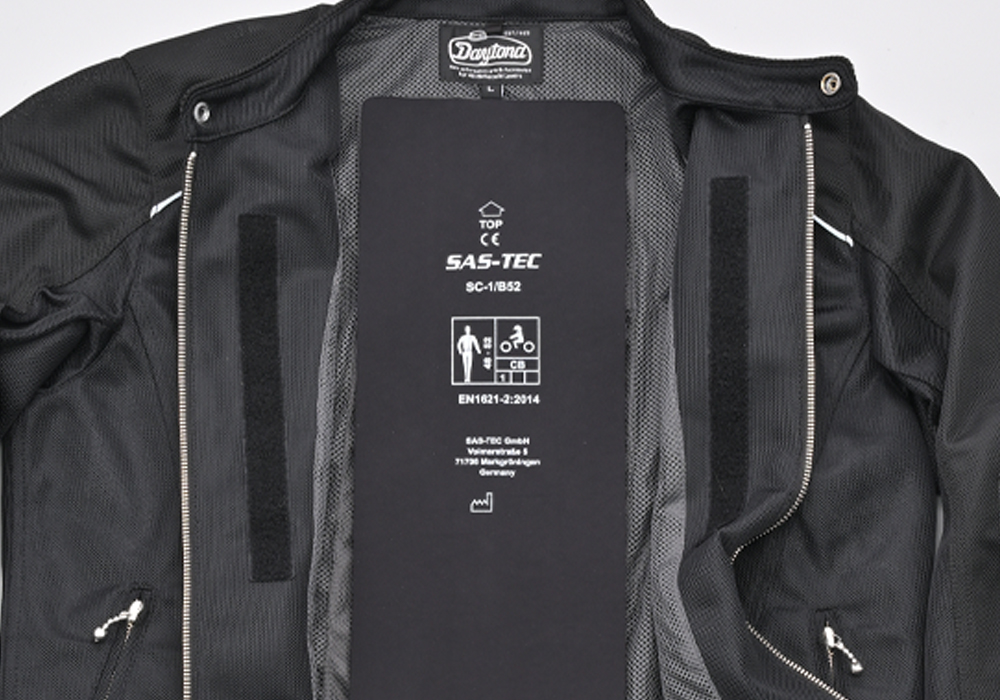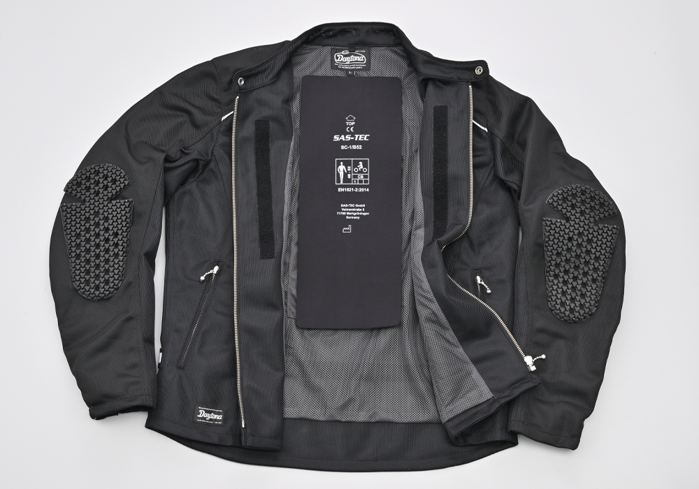 シンプルなシングルライダース風デザインのフルメッシュジャケット。ライディングポジションを考慮し、腕の位置や角度は前よりに、後身頃の裾は長くとっているためセパハンユーザーにもおすすめです。ひじ、背中のプロテクターには、【CE規格】をクリアしたTRIPLEFLEXタイプのSAS-TECを標準装備。胸部はCPS規格のプロテクターが装着できます。