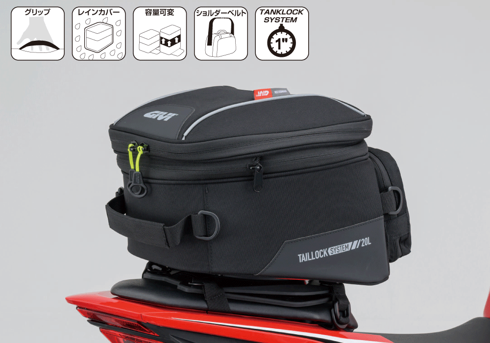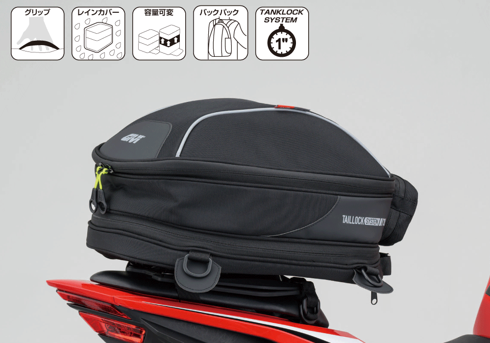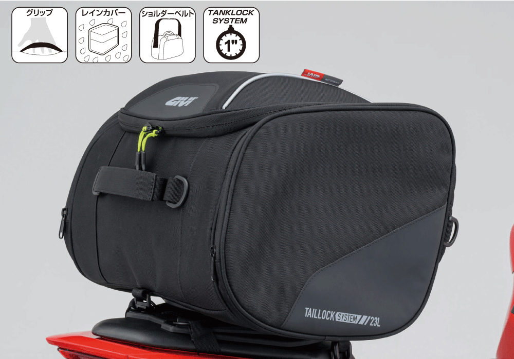 株式会社デイトナは、イタリア発オートバイ用品メーカーGIVI(ジビ)のテールロックバッグシリーズを発売した。別売のシートロックフランジと組み合わせて使用し、ワンタッチで簡単に脱着ができるアイテムである。バックパックとしても利用可能なTLB30は、25,300円。最大容量23LのTLB23は、26,400円。最大容量20LのTLB20は、22,000円。ダッフルバッグタイプのTLB18は、25,300円(いずれも税込)である。