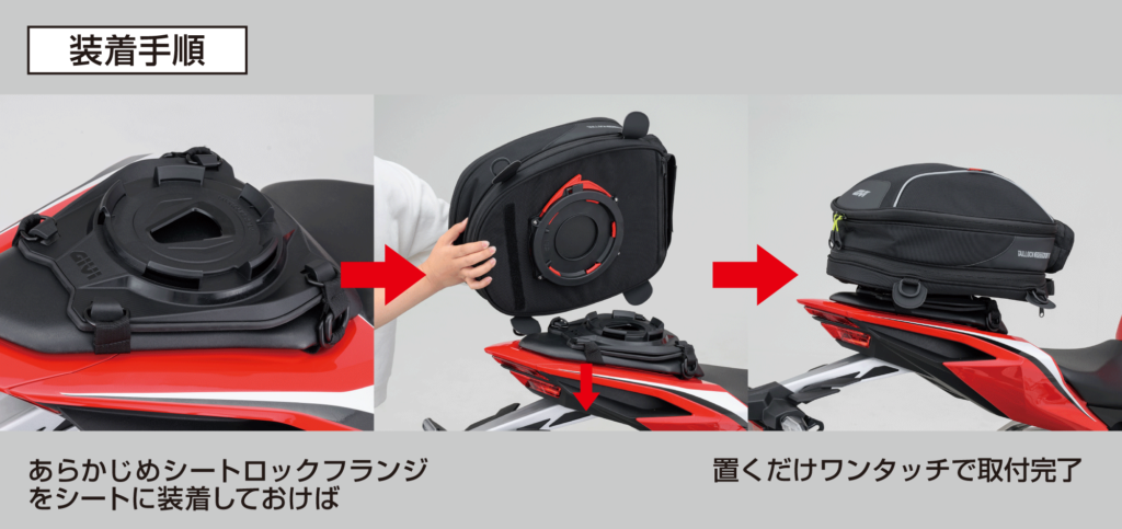 ワンタッチで簡単に脱着できるシートバッグ。別売のシートロックフランジと組み合わせて使用します。