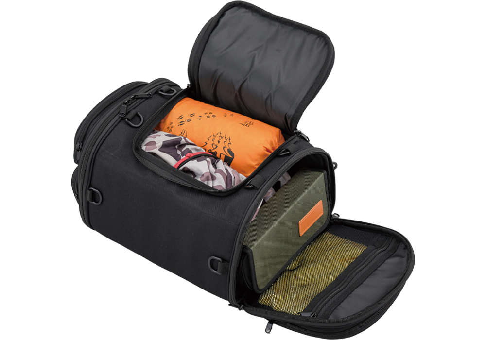 ダッフルバッグタイプのシートバッグ。荷物満載でも右サイドが開くので下に入れた荷物に簡単アクセス可能。サイドポケットはすぐに使いたい小物入れに便利です。