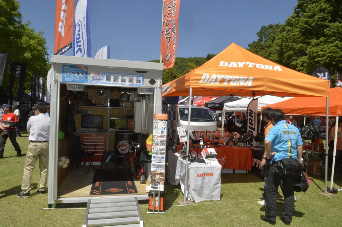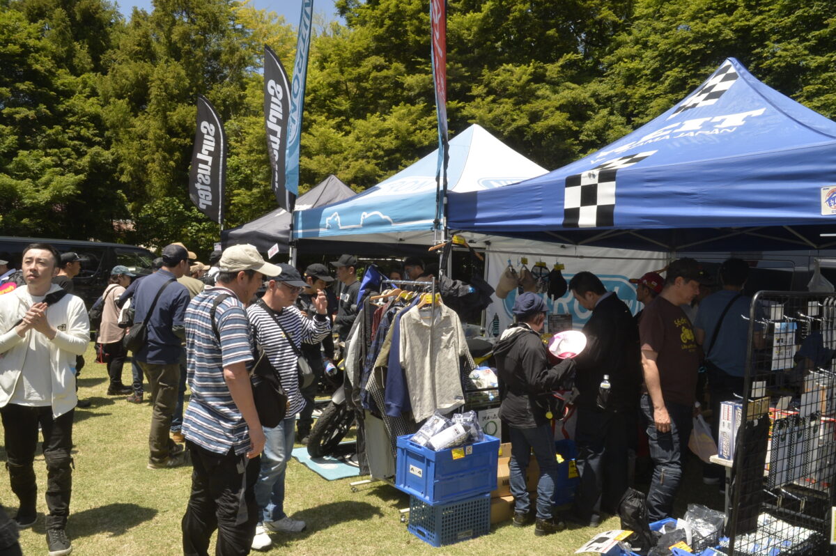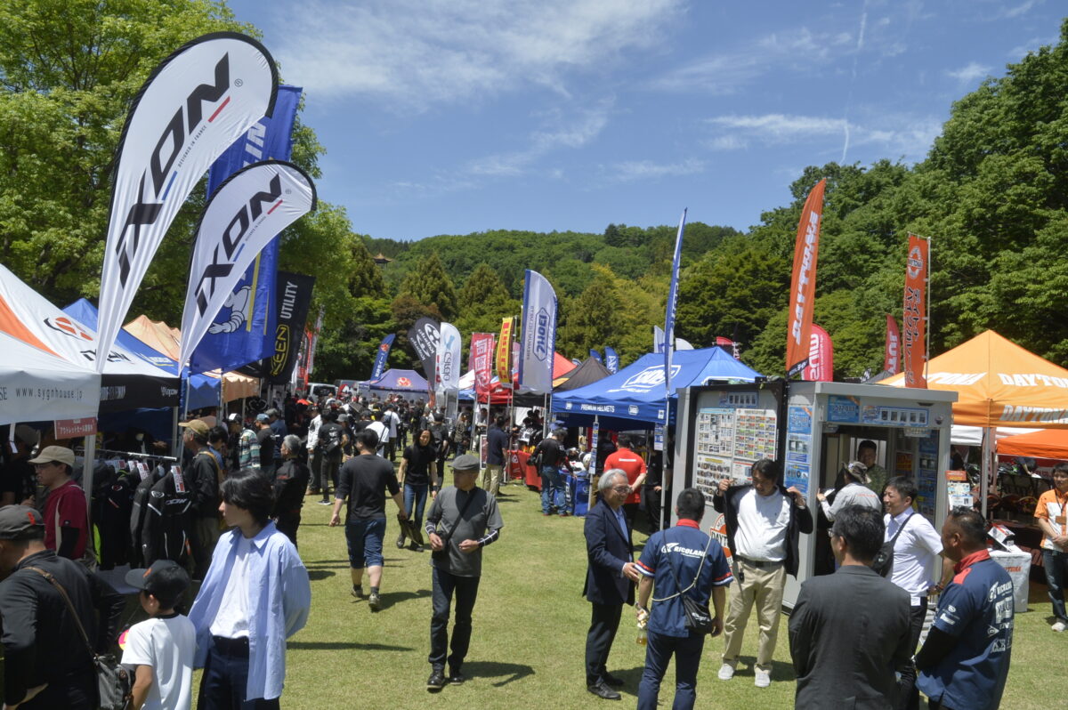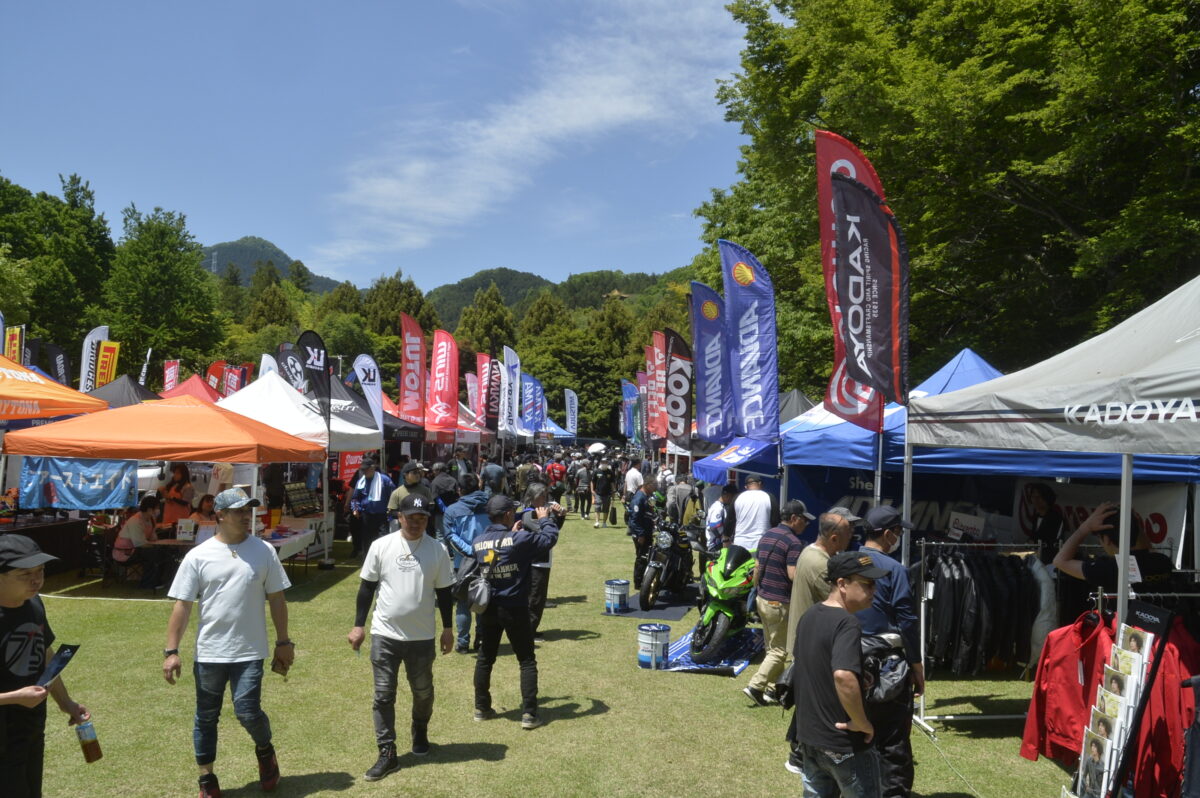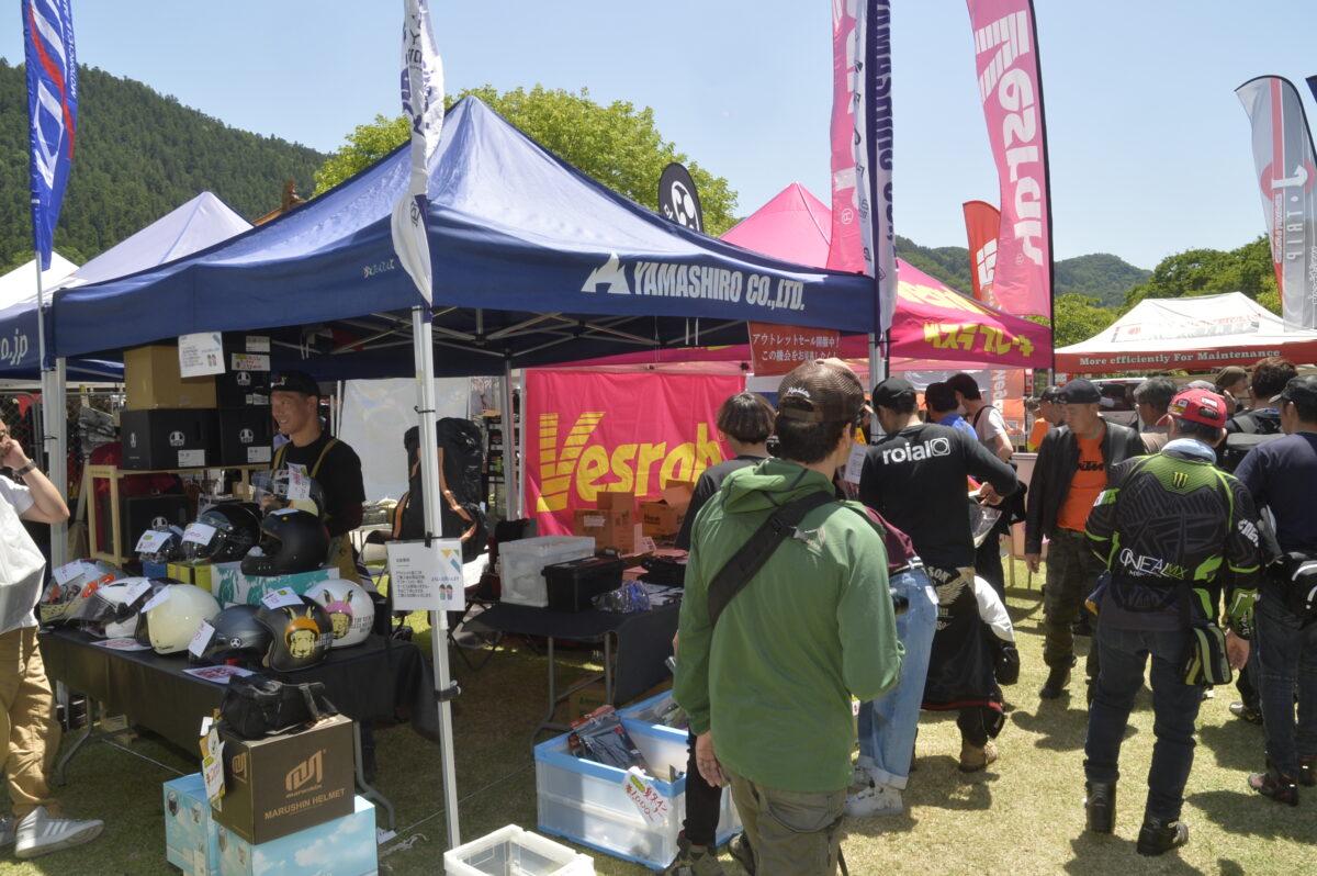 イベントステージの奥にある芝生スペースでは、バイク関連メーカー50社の出展ブースも用意され、お得なアイテムや掘り出し物の販売、小鹿野町の地元グルメ『わらじかつ』のお弁当、『毘沙門水』で作るかき氷を販売するフードコーナーも用意。購入した多くのバイク用品を抱えたり、わらじかつ弁当やかき氷を味わいながら仲間と談笑するライダーの姿も目に付いた。
