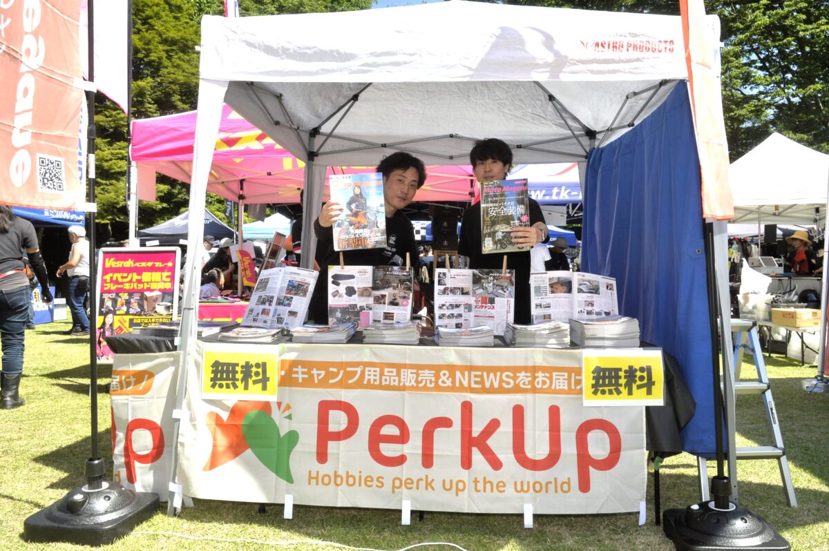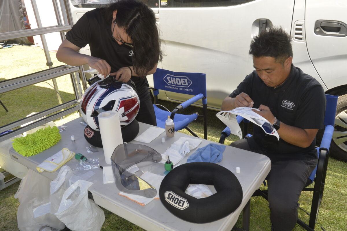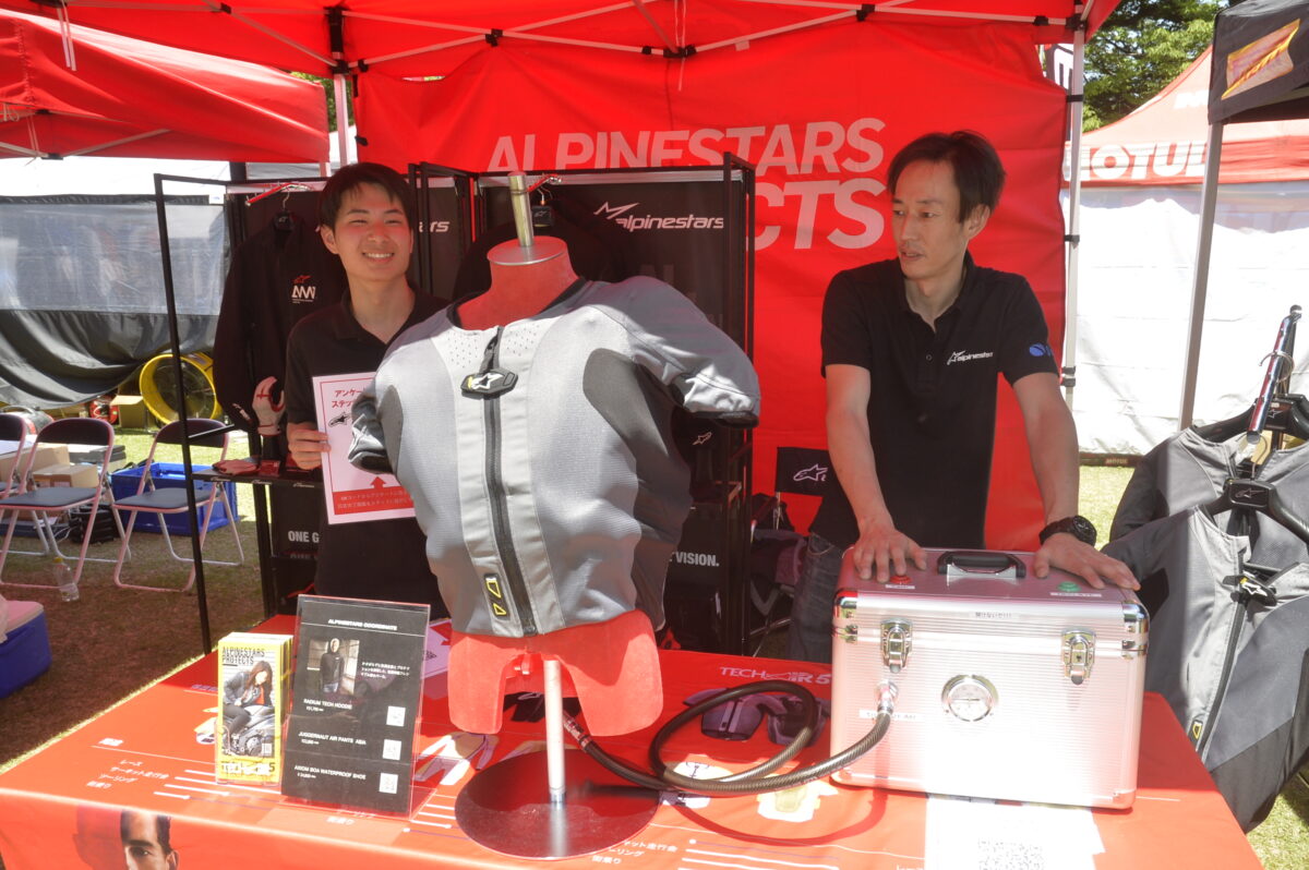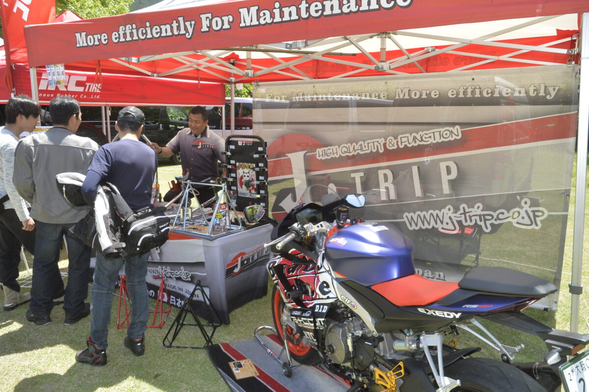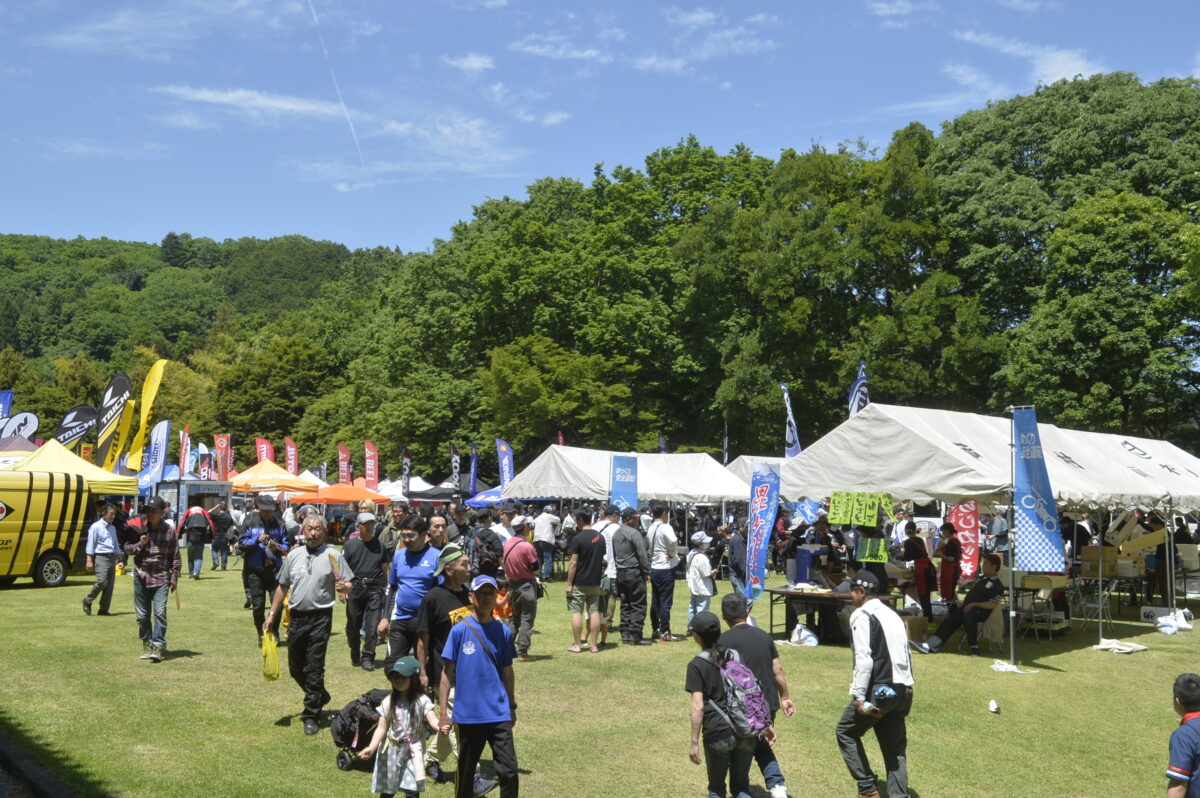 イベントステージの奥にある芝生スペースでは、バイク関連メーカー50社の出展ブースも用意され、お得なアイテムや掘り出し物の販売、小鹿野町の地元グルメ『わらじかつ』のお弁当、『毘沙門水』で作るかき氷を販売するフードコーナーも用意。購入した多くのバイク用品を抱えたり、わらじかつ弁当やかき氷を味わいながら仲間と談笑するライダーの姿も目に付いた。