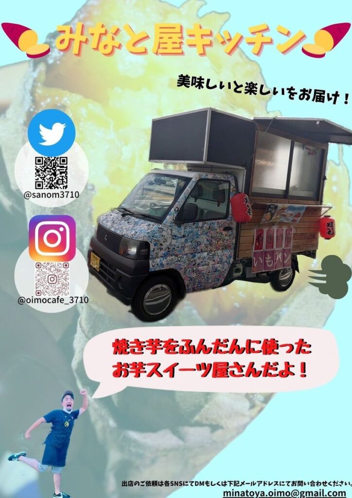 桜ヶ丘駅西口か ら徒歩5分の壺 焼き芋専門店「み なと屋Cafe」の キッチンカーです。 壺焼き芋専門店 ならではのスイー ツが人気です!