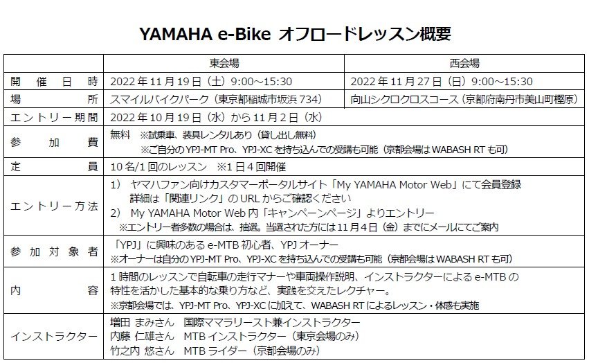 「YPJ-MT Pro」や「YPJ-XC」のオーナーは車両持ち込みでの参加が可能。希望者には車両の貸し出しも行います。インストラクターは、国際ママラリースト兼インストラクターの増田 まみさん、MTBインストラクターの内藤 仁雄さん(東京会場のみ)、MTBライダーの竹之内 悠さん(京都会場のみ)といった豪華なメンバーを予定しています。