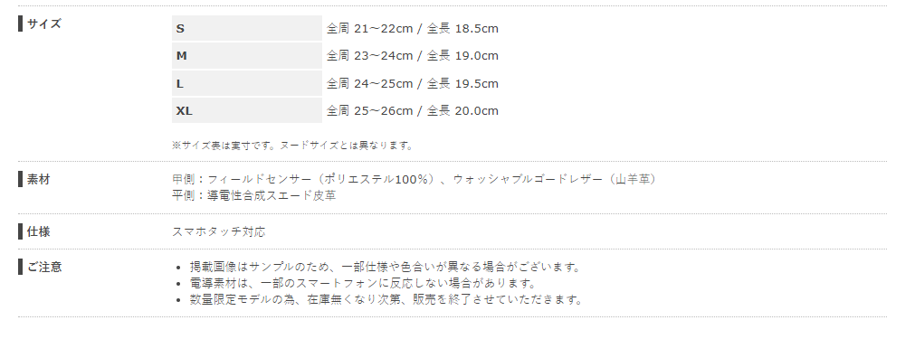 - 電導素材の採用により、グローブをしたままでもスマートフォンの操作が可能です。