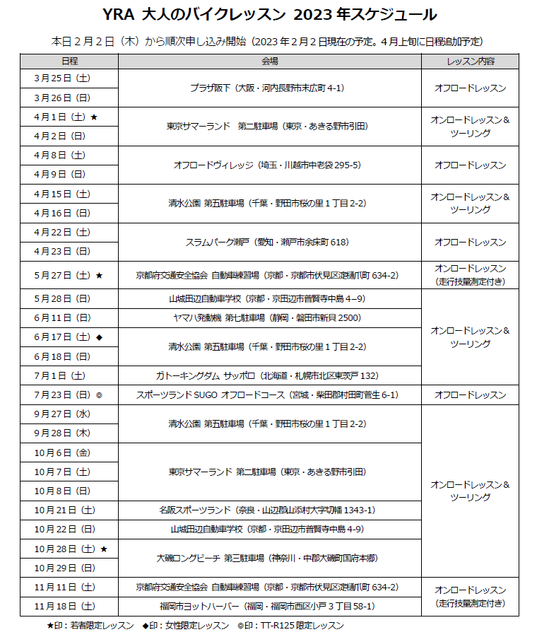 お待たせいたしました。YRA「大人のバイクレッスン」の2023年の開催スケジュールを公開しました!