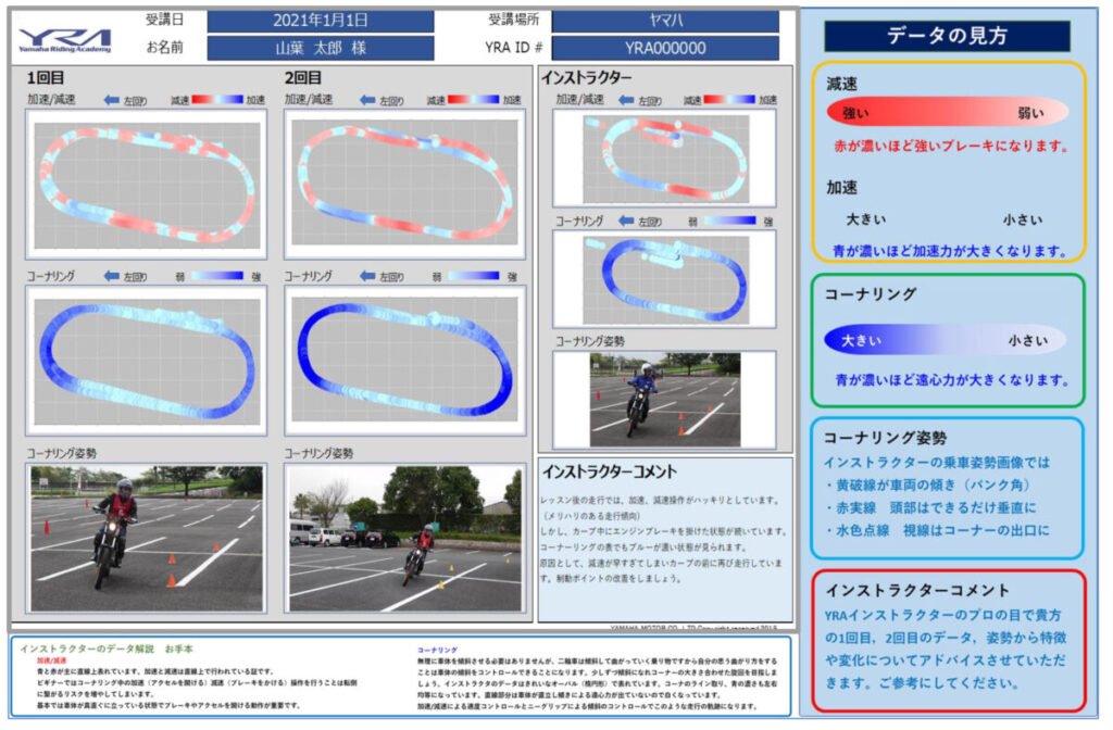 「加速・減速」「コーナリング」を表す画像、旋回時に撮影した乗車姿勢の写真、またお手本となるインストラクターの走行データや、現地での指導とデータ分析に基づく個別アドバイスも記載しています。
