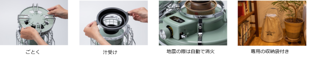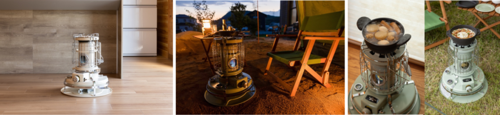 最大で約18時間燃焼を継続するため、室内はもちろん、寒い時期のアウトドアも快適に過ごすことができます。また、燃料である灯油が燃焼する際に、大量の水蒸気が発生することにより、暖房中に空気が乾燥しないところも特長のひとつです。さらに、サイズはアウトドアにも持ち運びやすいコンパクトにして使いやすさを実現しました。