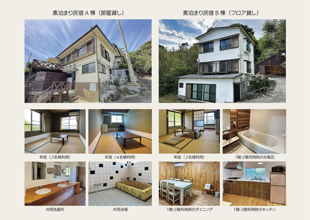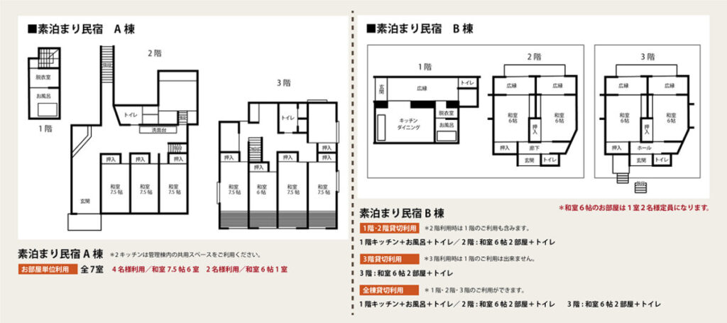 素泊まり民宿はお部屋単位で利用できるA棟とご利用人数に合わせて貸切の出来るB棟の2タイプ。