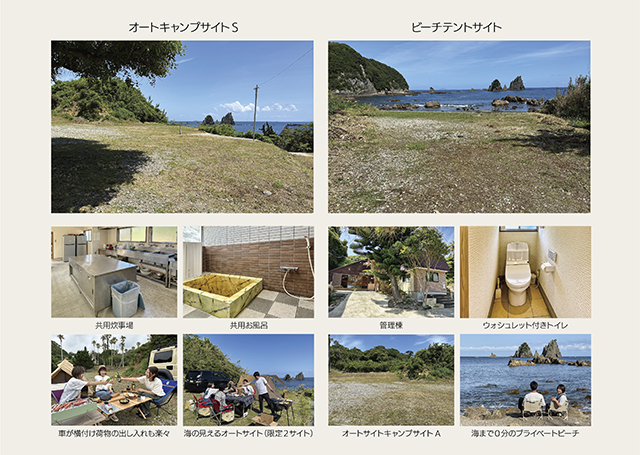 テントやギアで自分スタイルのキャンプを楽しむビーチキャンプサイトや車やオートバイが乗り入れできるオートキャンプサイト。