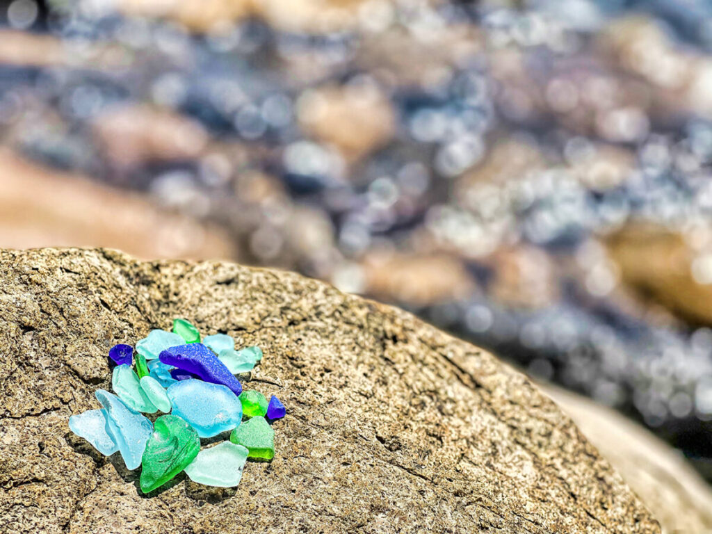 小石まじりの海岸では子供も喜ぶシーグラスを集めてアクセサリー作りはいかがですか。