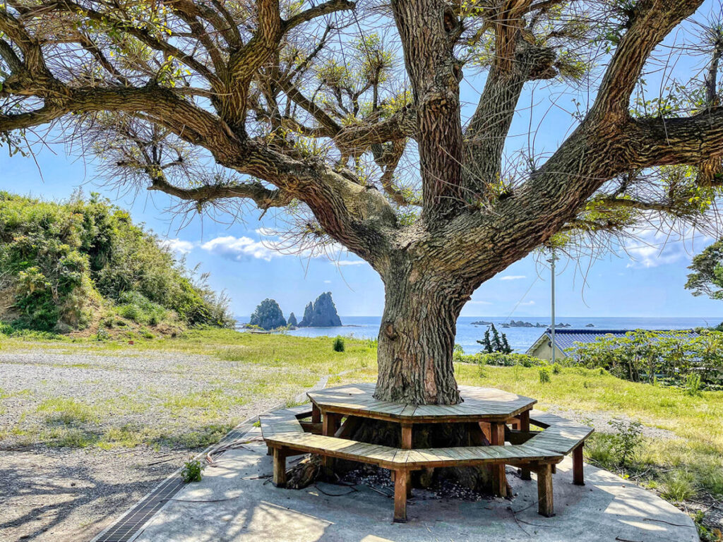 沖に群生する奇岩。その昔、役の行者が飛行用の衰をこの岩に掛けたという伝説からその名があります。