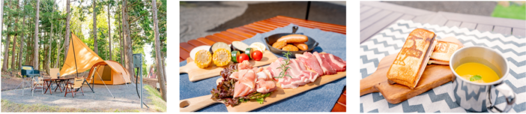 夕食・朝食付の手ぶらプランで何も気にせずキャンプを満喫!テント、タープ、フロアマット、シュラフ(人数分)、テーブル&チェア、ランタン、ハンディライト(人数分)、ガスコンロ(鉄板・ガス)、ホットサンドメーカー、食器類(1名につき1セット)、夕食(スタンダードBBQセット)、朝食(ホットサンド、スープ)付