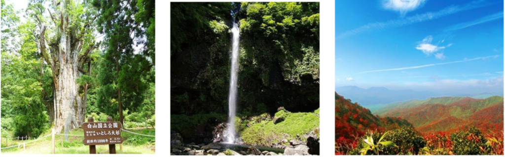 キャンプ場周辺には自然スポットがたくさんあります。清流『石徹白川』をはじめ、大蛇が住むという伝説のある村間ヶ池、推定樹齢は1,800年の特別天然記念物(国指定)の石徹白大杉、白山中居神社の巨木の森、落差60m日本の滝百選の阿弥陀ヶ滝、標高1,709m大日ヶ岳など、全て回るには、1日では足りないほど。