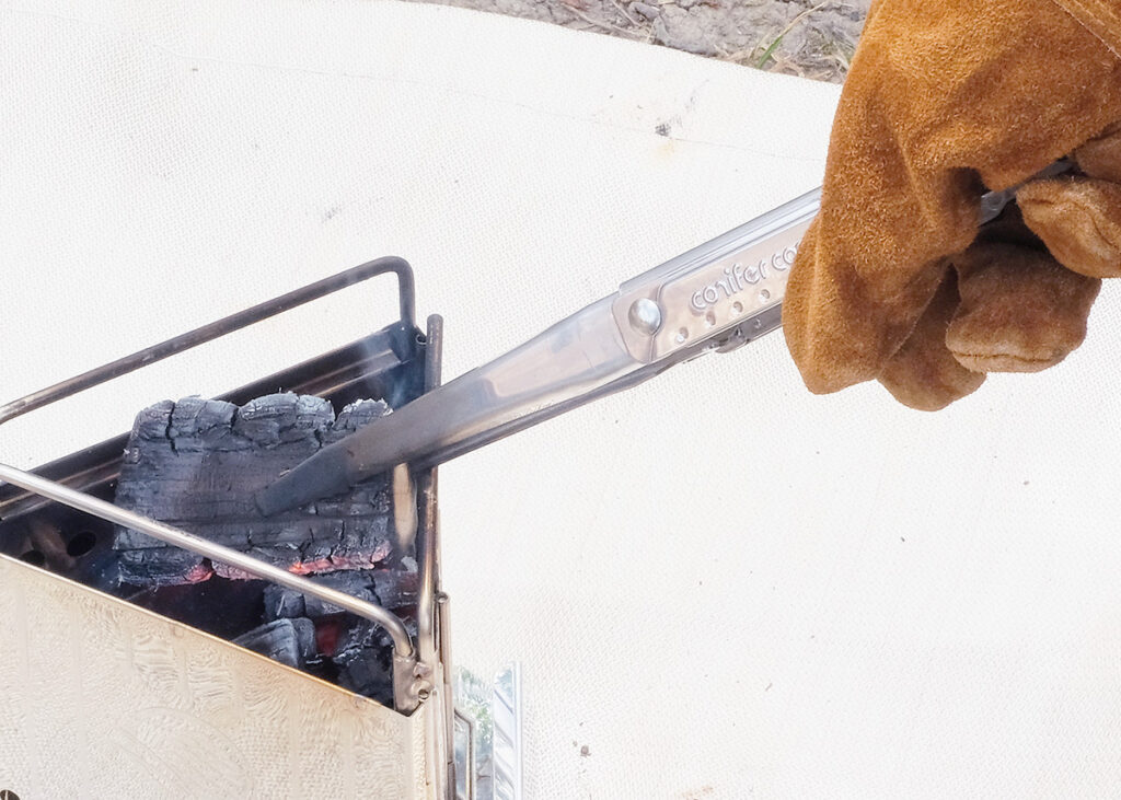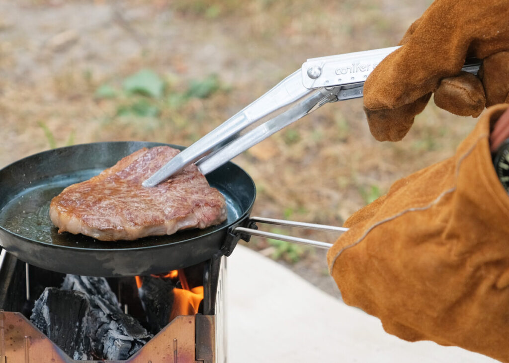 がっちりと力を込めて握ることができる 「ストレートアングル」 では、 厚切りベーコンなどの分厚いお肉や、 調理や焚火に使う炭や薪なども安定してつかむことができます。