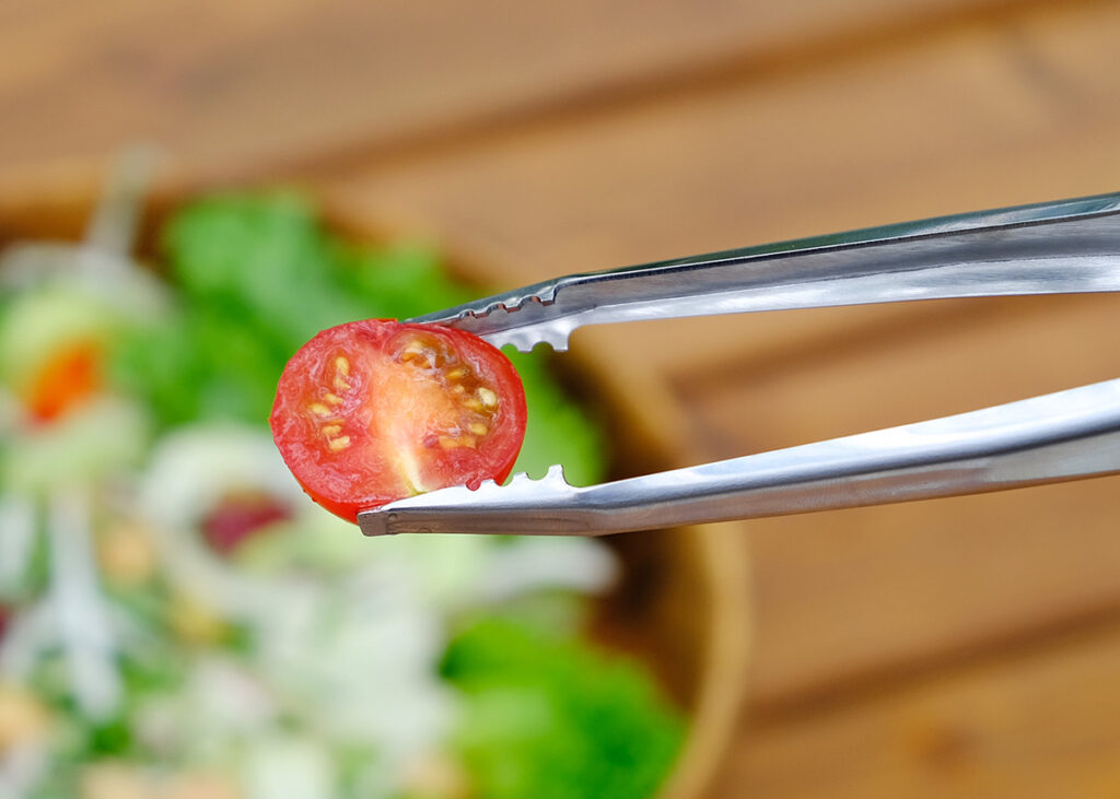 ピンセットのような角度で繊細な力加減が可能な 「斜めアングル」 では、 生ハムや葉物などの薄くて破れやすいモノや、 カットしたトマトや茹でた柔らかいビーンズなども潰すことなくつまむことができます。