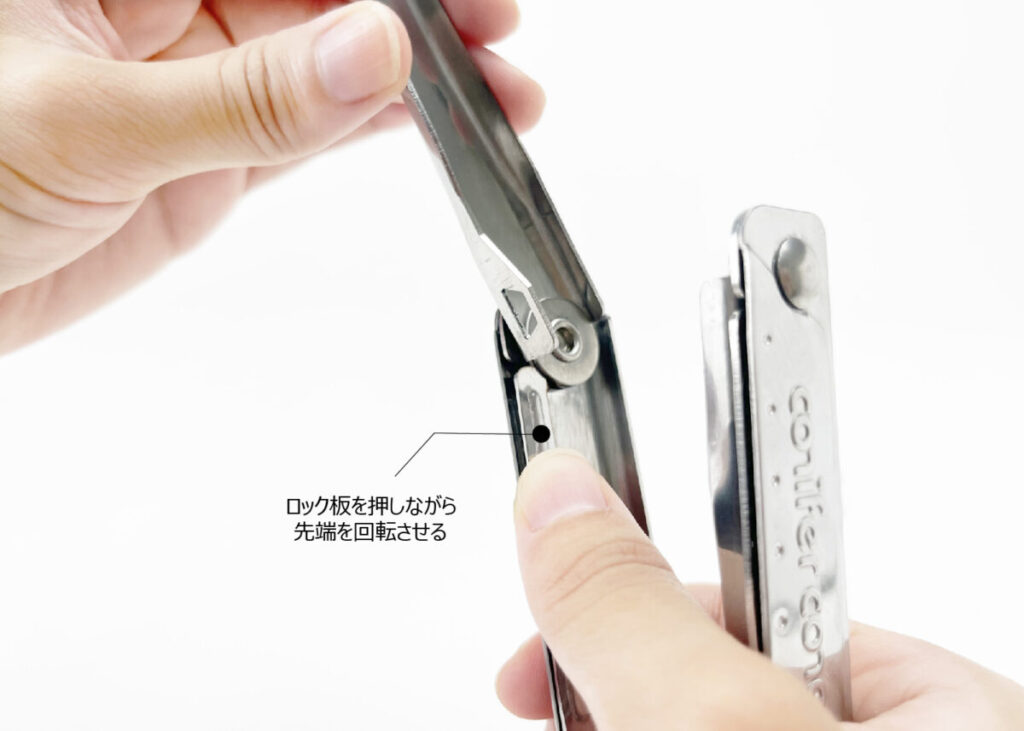 新たに追加された、 2つの角度をキープする 「ロック機構」。 アングルを変える時には 「ロック板」 を押し、 ロックを解除しながら先端を回転させます。 それぞれの角度でしっかりとロックがかかるので、 モノをつかんでもずれることなくそれぞれの角度をキープ。 角度を変える度にカチッとハマる小気味よいギミック感は、 コニファーコーンならではのこだわりどころです。