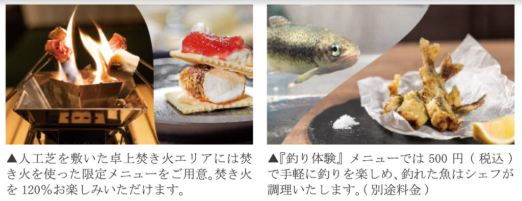 夜キャンプをコンセプトにした上品な空間で、雨風を気にせずに焚き火や釣り体験を楽しむことができます。