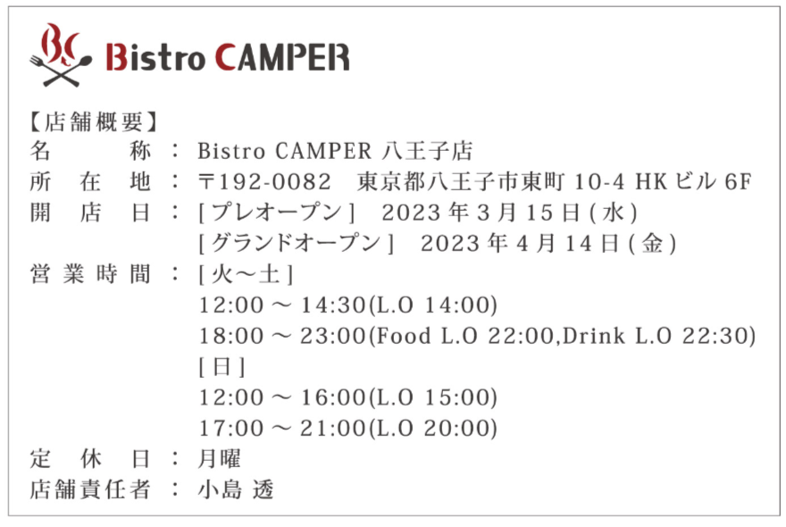 2023年4月14日(金)、ブッシュクラフト株式会社(所在地:東京都町田市、代表取締役:相馬拓也)がアウトドア体験型レストラン『Bistro CAMPER』をオープンしました。