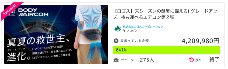 昨年クラウドファンディングにて先行販売したボディエアコンシリーズの「野電 ボディエアコン・Vツインクール」は842%で達成!