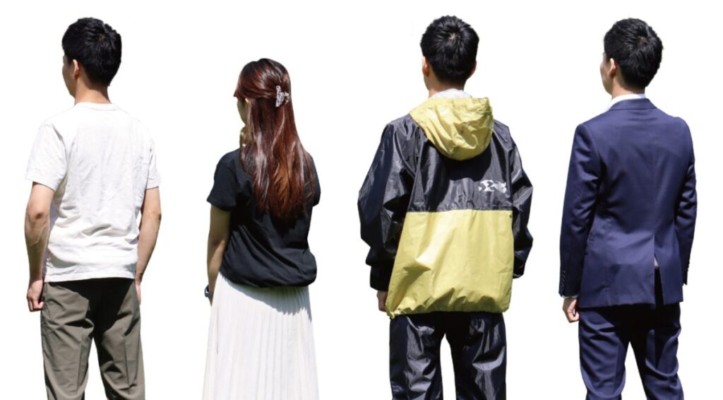 Tシャツはもちろん、ビジネススーツや雨の日のレインウエアでも着用できるこだわりのデザイン。場所やシーンを選ばすに幅広いシーンで大活躍!