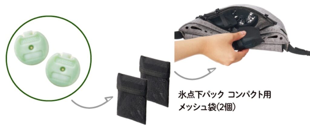 別売りの「氷点下パック コンパクト」と組み合わせれば、夏の暑い日差しの下でもひんやり冷たい風が熱くなった身体を冷やすことができる。付属のメッシュ袋(2個)に入れて使用可能。