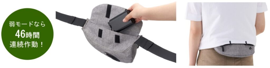 風量は暑さに応じてお好みで3段階に調節可能なほか、市販のモバイルバッテリーが電源となるUSB式で、弱モードであれば46時間の連続作動可能です。また、本体には服の裾を固定するためのフックが付いており、上着の裾が極端に長い服や短い服、フィット感のある服でも、ファンを塞いだり送風を妨げたりすることなく使用できます。