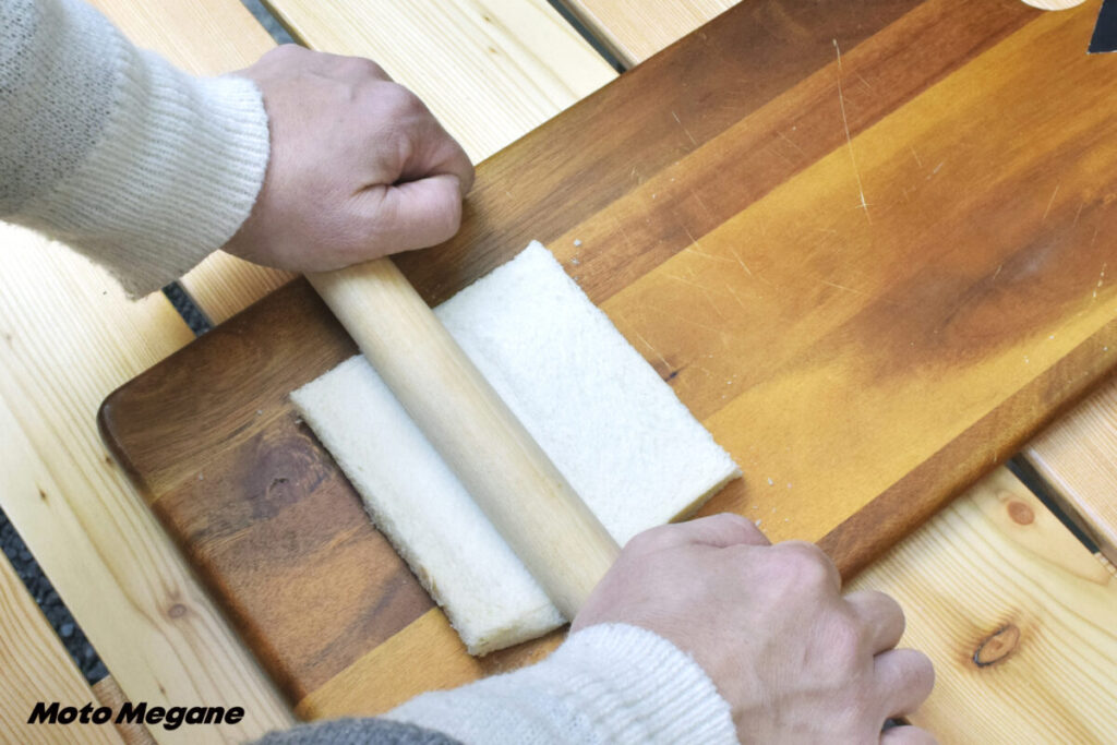まずは、食パンを綿棒で伸ばす。こうすることで、食べごたえのある太めのウインナーも収まる長さとなり、巻き込んだときにパンが破れるのも防いでくれる。