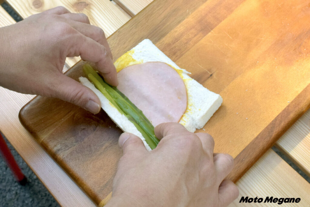 ハムと茹でたアスパラもくるくる巻いていこう。こちらも巻き終わったら、食パンの閉じ目を下向きに。