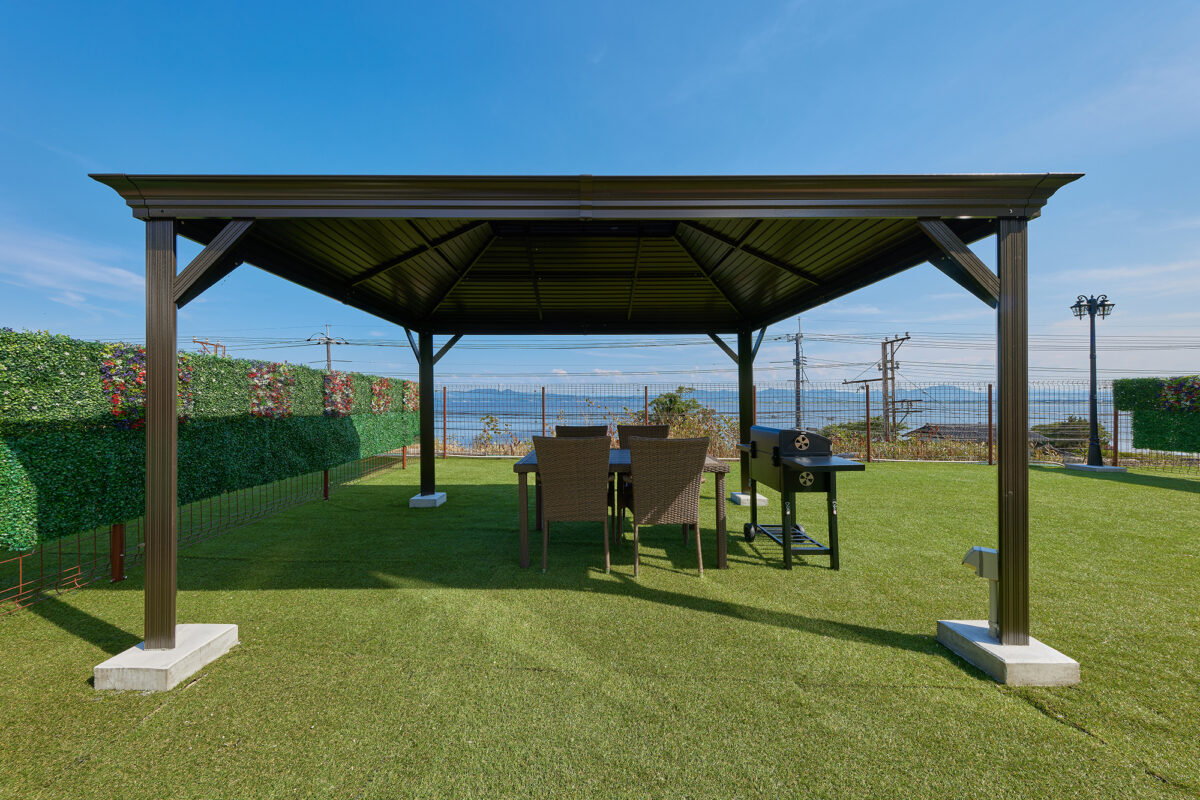 各ドーム型テントに隣接して雨天時や悪天候時でもBBQが楽しめる全天候型の専用食事スペースを配置。
