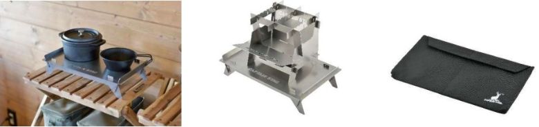 焚火台の土台、ソロテーブル、ベンチ焚き火台の延長トレーとしても使用できるマルチテーブル。パネル組み立て方式で、薄型収納バック付き。